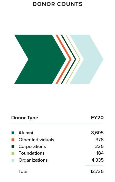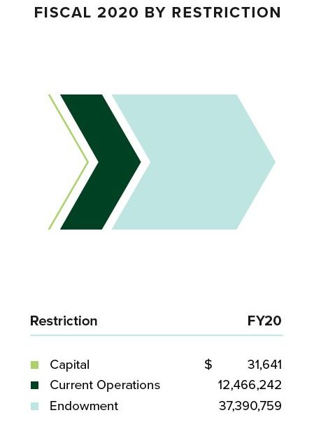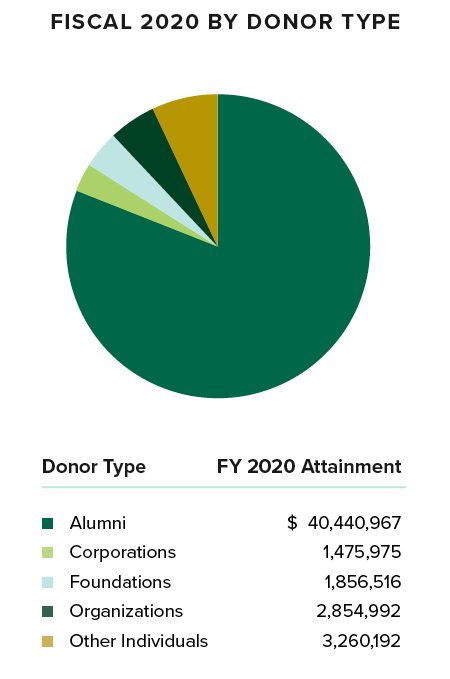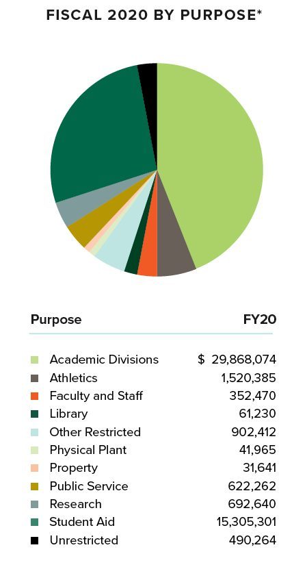 Reporting of gifts by purpose adheres to guidelines from the Council for Aid to Education (CAE). Gifts to support the academic department of health, physical education, and recreation are reported under “Academic Divisions”; gifts to support athletic scholarships are reported under “Student Financial Aid”; and gifts for capital projects are reported under “Physical Plant” or “Property.”