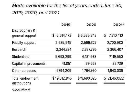 Endowment earnings are authorized for expenditure based on the endowment’s average market value for the trailing 36 months. For fiscal years 2019, 2020 and 2021, the spending rate was 4% for endowed accounts whose market value exceeded the historic gift value. Occasionally, due to a downturn in the investment market, an account’s market value may temporarily fall below its historic value. When this occurs, the endowed account is “underwater.” The spending rate for underwater endowments is 1%.